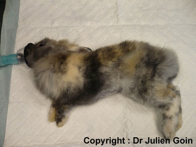 Le lapin est ensuite contenu dans une serviette et un masque est appliqué contre son museau dans le but de lui faire inhaler un anesthésique gazeux (ex : isoflurane). L’induction de l’anesthésie se fait en quelques minutes et le lapin s’endort progressivement jusqu’à ne plus réagir à aucun stimulus.