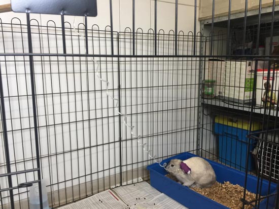 Afin de vous éviter un stress inutile à l'arrivée du lapin, pensez à préparer quelques accessoires qui peuvent se révéler bien utiles. Demandez à votre vétérinaire si les mouvements de votre lapin devront être limités auquel cas, il faudra modifier l'environnement de votre lapin et si besoin le mettre en enclos ou même en cage de convalescence. La cage de convalescence peut permettre de sécuriser un lapin qui semble perdu sous l'effet d'un antidouleur puissant. Sur cet exemple, Malou a du mal à supporter un dérivé morphinique et est confiné pour pouvoir se reposer sans craindre l'environnement ni son compagnon. Le lendemain, son compagnon vient lui rendre visite pour un repas commun et comme Malou a repris ses esprit et ne semble plus nauséeux, il retrouve ensuite la liberté.